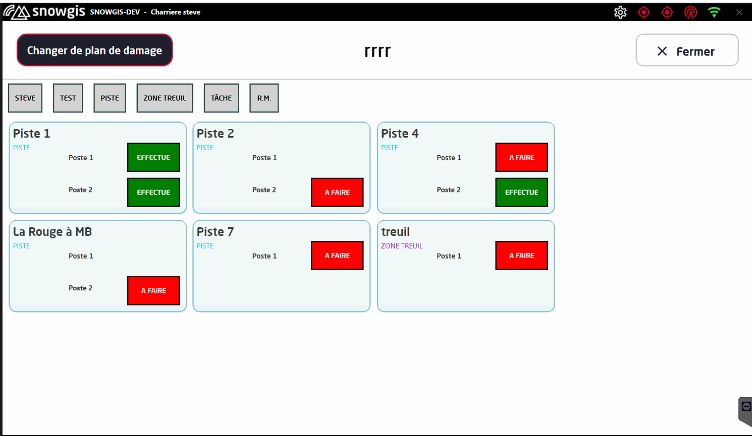 les pistes à effectuer sont identifiées par un contour jaune. lorsque la piste est réalisée et validée, ce contour est automatiquement supprimé sauf si il est faire sur les deux postes. ce fonctionnement permet à tous les véhicules de visualiser en temps réel les pistes déjà effectuées ainsi que celles restant à traiter.