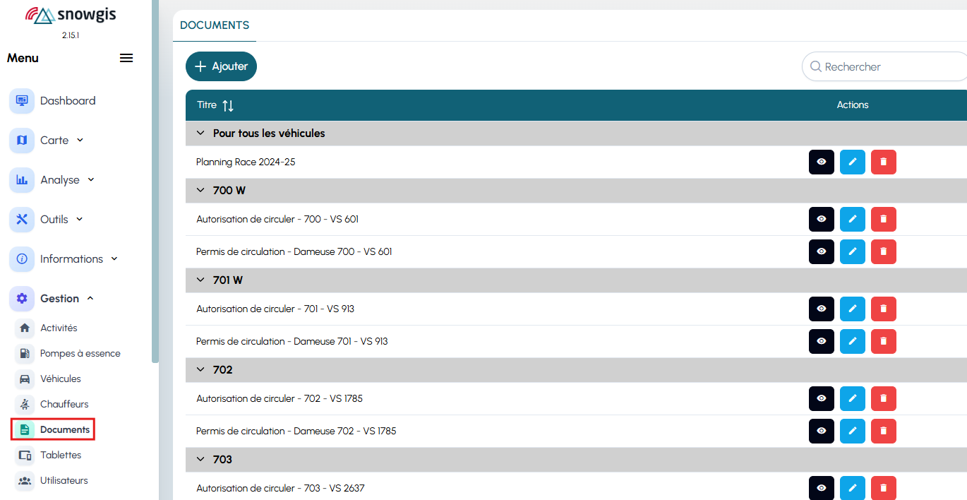 la section gestion des documents centralise tous les fichiers officiels liés aux véhicules et chauffeurs.