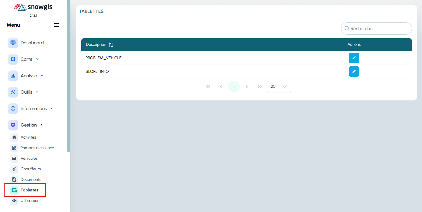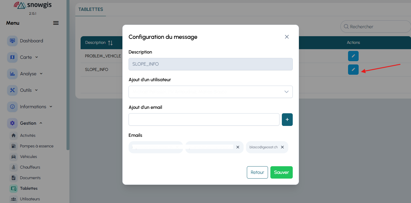 la section gestion des tablettes permet de configurer les destinataires des messages automatiques envoyés depuis les tablettes SnowGIS.