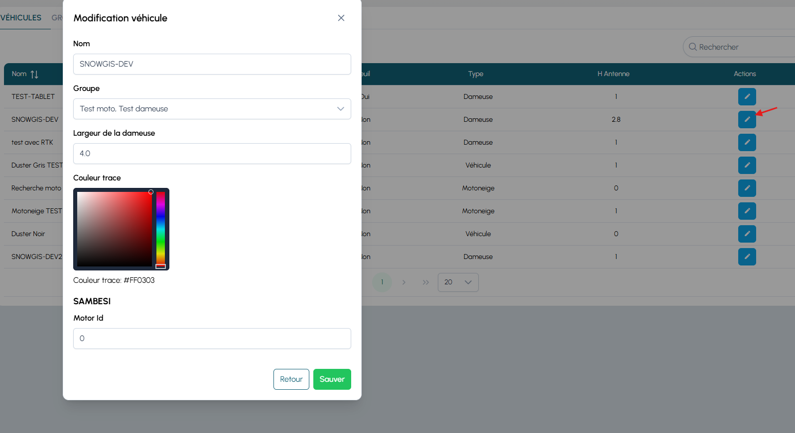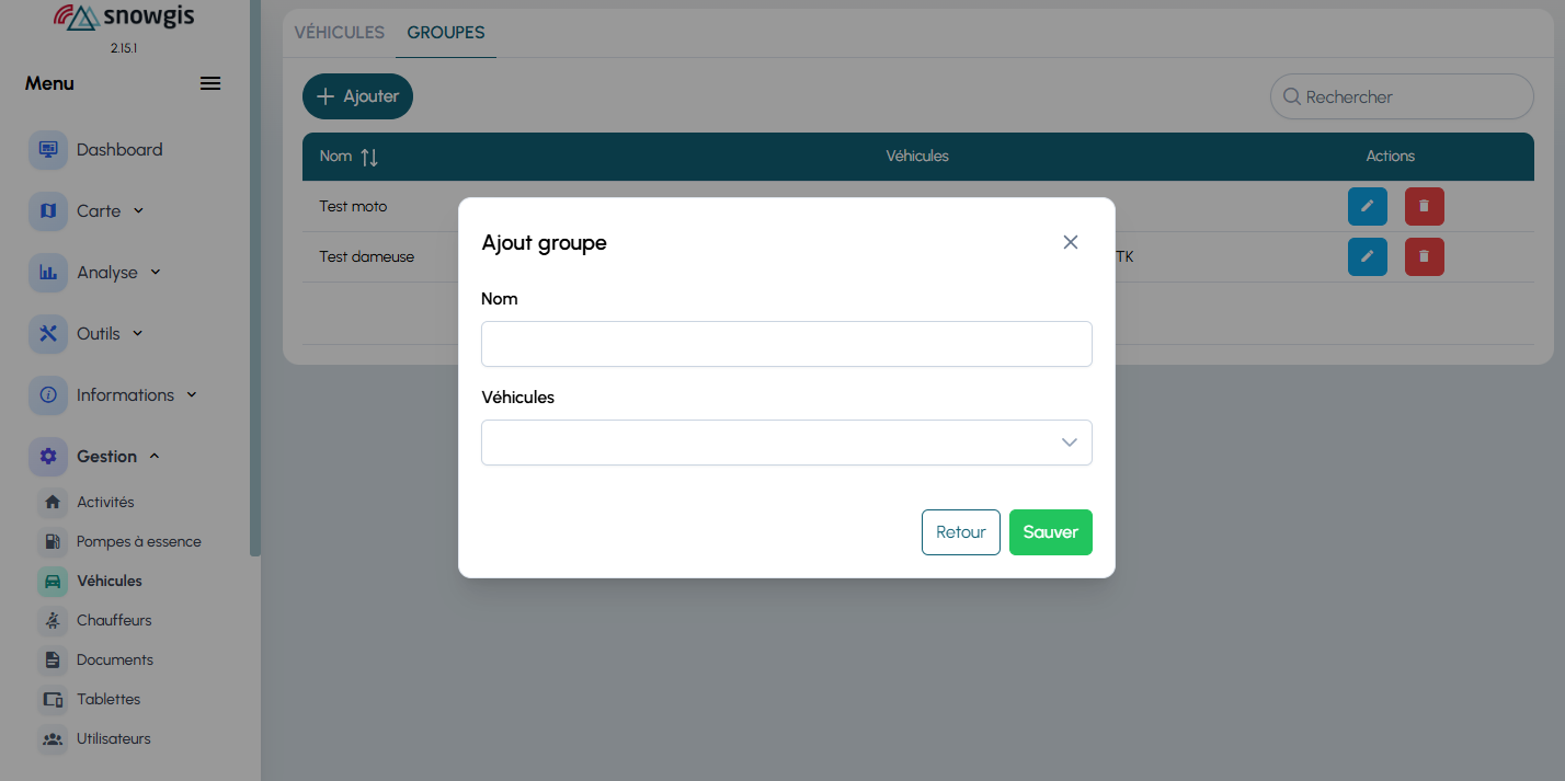 la section gestion des véhicules répertorie l’ensemble des véhicules équipés de SnowGIS.