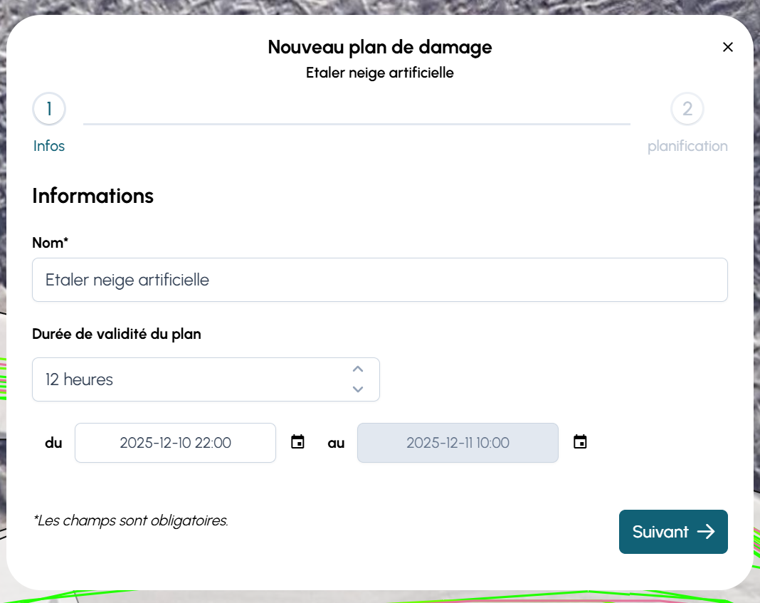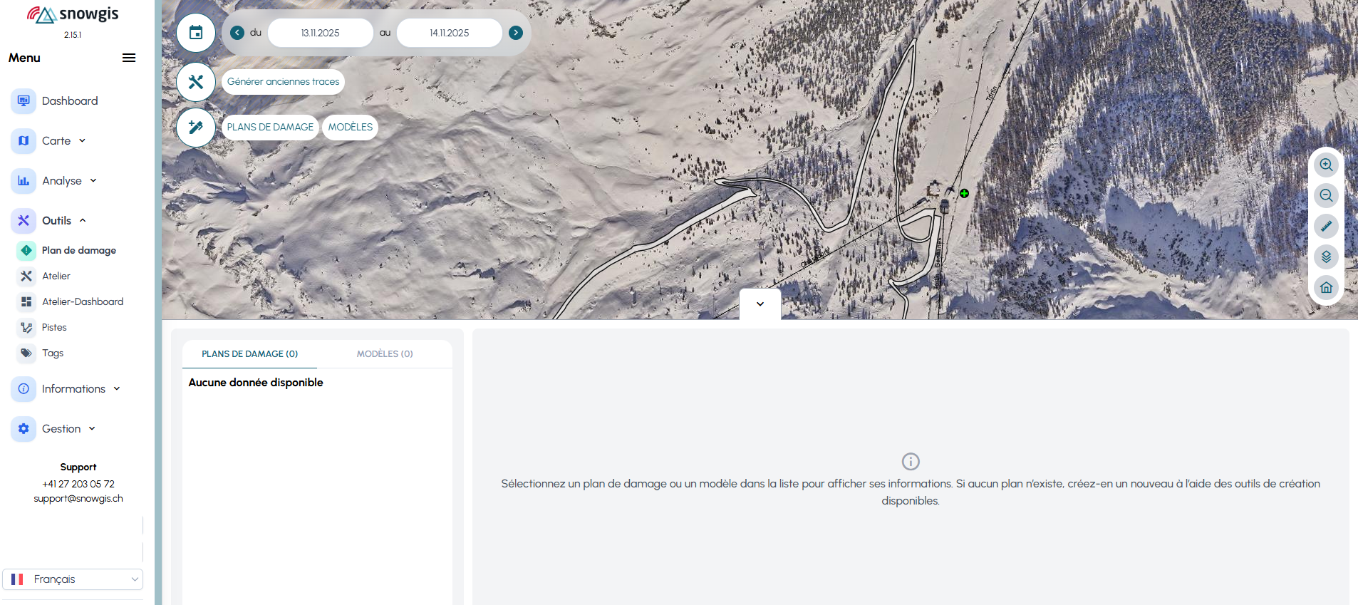 | Plans de damage | Liste des plans existants pour la période sélectionnée. |