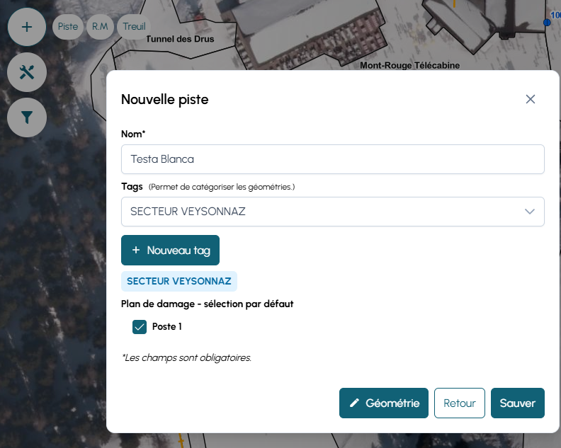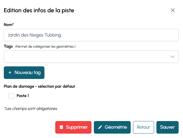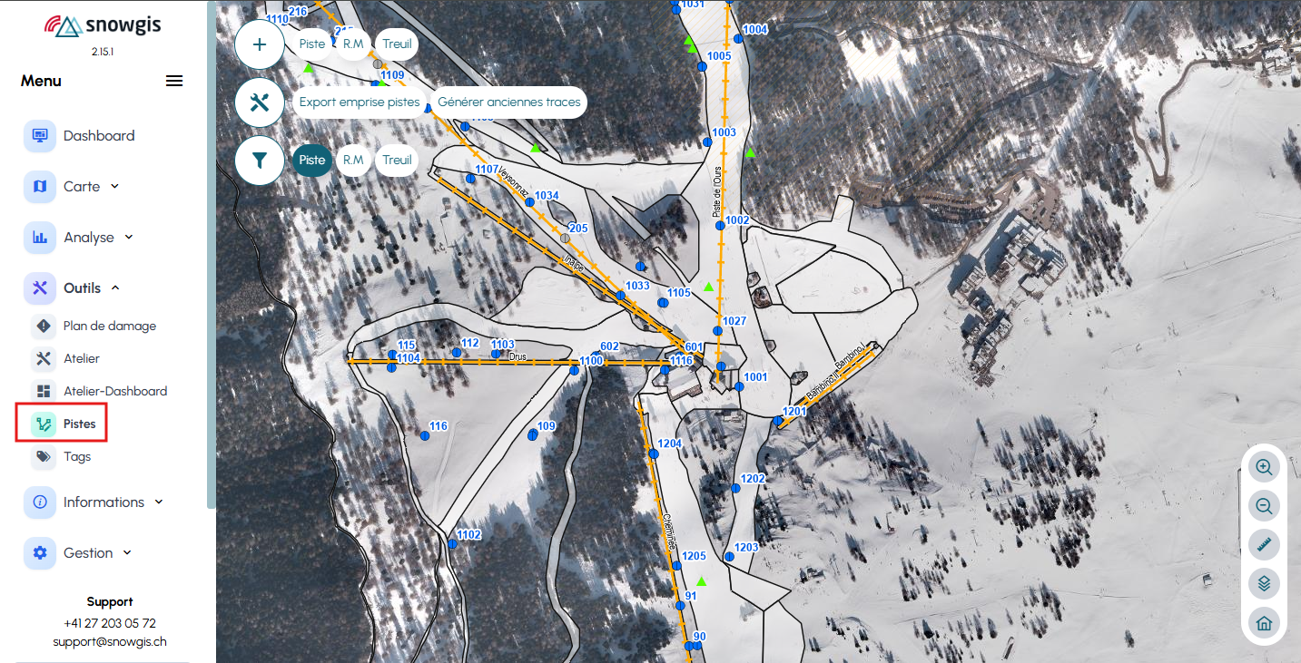 Toute modification de la géométrie d’une piste impacte directement les valeurs utilisées dans les rapports et peut fausser les données. En cas de doute ou de modification importante, veuillez contacter le support SnowGIS.