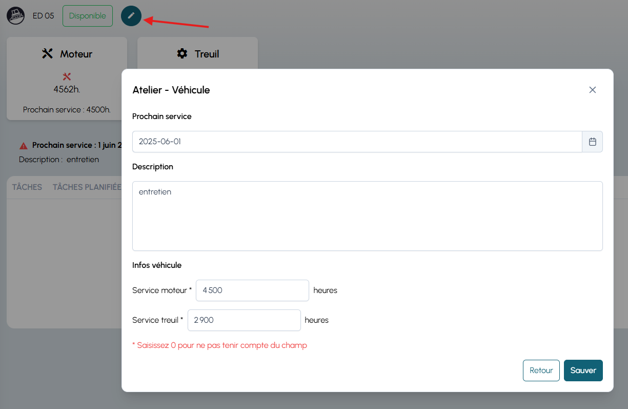 Depuis la page de détail du véhicule, le bouton Modifier (icône stylo) ouvre la fenêtre d’édition des informations de service :