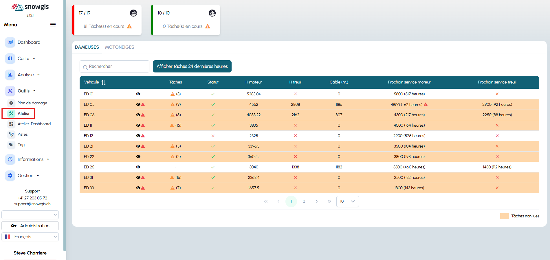 - deux onglets en haut : Dameuses et Motoneiges ;