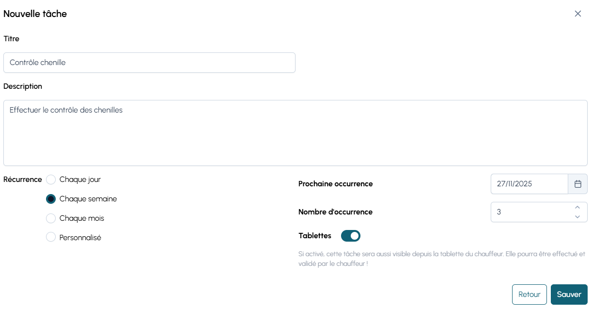 - Activer l’option Tablettes si la tâche doit apparaître sur la tablette du chauffeur pour validation terrain.