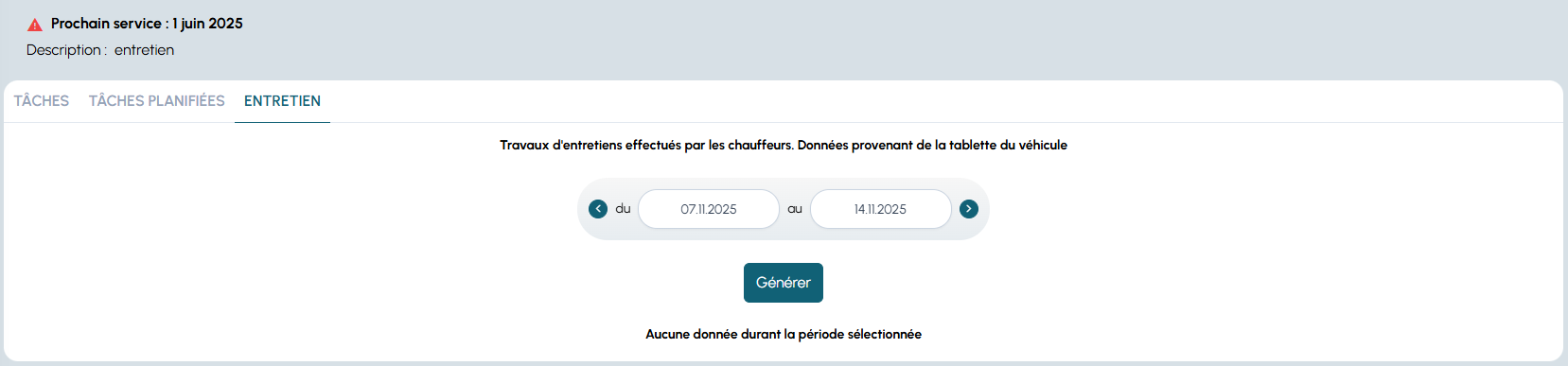 l’onglet Entretien affiche les travaux d’entretien effectués par les chauffeurs, remontés depuis les tablettes.