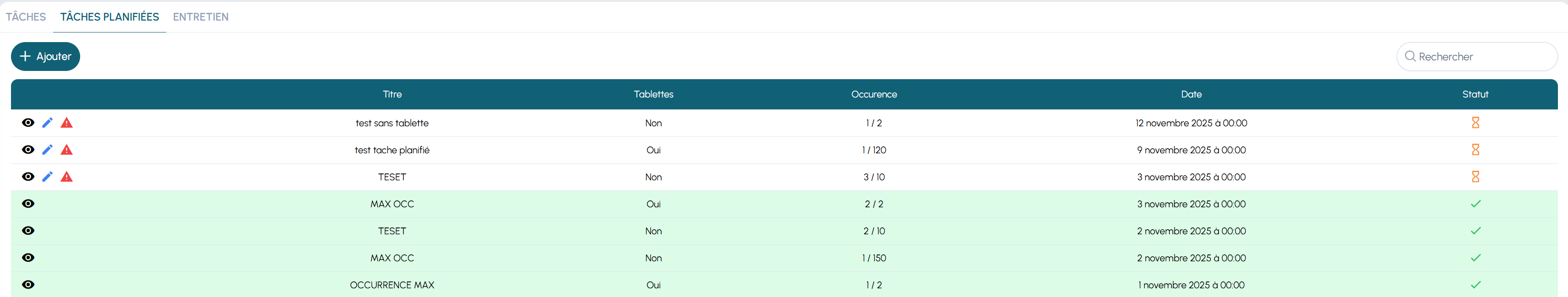 une tâche planifiée génère automatiquement des occurrences dans l’onglet Tâches, prêtes à être traitées et validées.